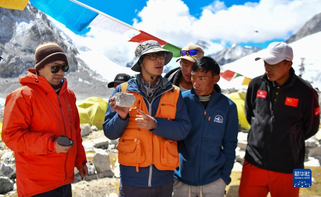 科考隊隊員劉小馳(左二)在為西藏登山隊隊員講解如何采集峰頂至前進(jìn)營(yíng)地的巖石樣本(9月27日攝)。
