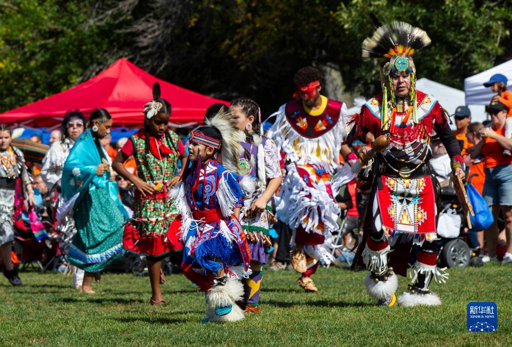 9月30日,身著(zhù)原住民服飾的人們在加拿大多倫多舉辦的“全國真相與和解日”紀念活動(dòng)中表演舞蹈。