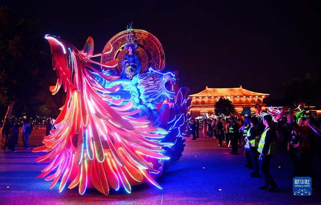 游客在西安大明宮國家遺址公園觀(guān)看彩車(chē)巡游(9月30日攝)。