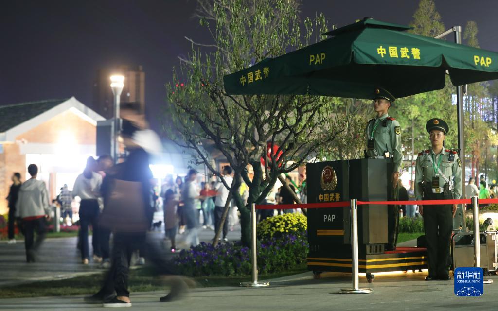 在第十四屆中國(合肥)國際園林博覽會(huì )現場(chǎng),武警安徽總隊合肥支隊官兵在重點(diǎn)區域站崗執勤(9月30日攝)。