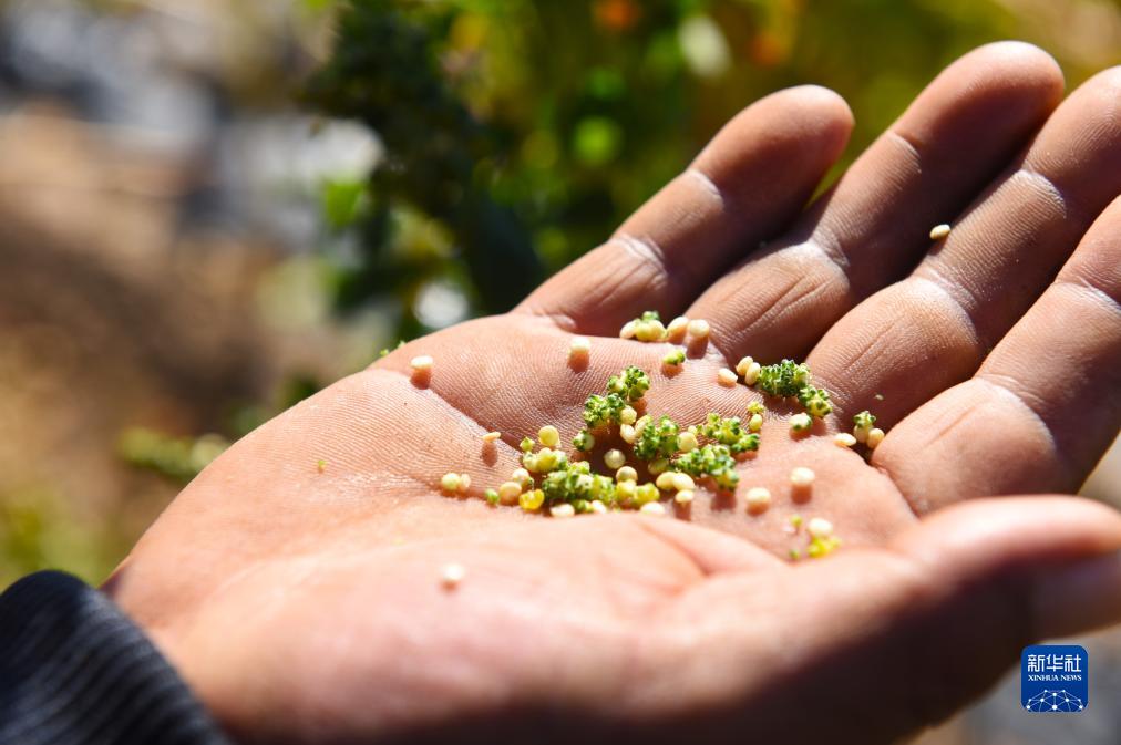 10月1日,在沽源縣白土窯鄉小西溝村,當地農戶(hù)展示手搓后的成熟藜麥粒。