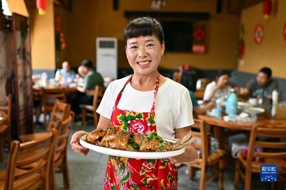 在山西磧口古鎮,村民賈娟展示自家飯店的菜品(8月2日攝)。賈娟原來(lái)是磧口古鎮的導游,2011年開(kāi)始經(jīng)營(yíng)飯店。隨著(zhù)來(lái)磧口古鎮旅游的客人逐年增加,賈娟的飯店生意也越來(lái)越好。