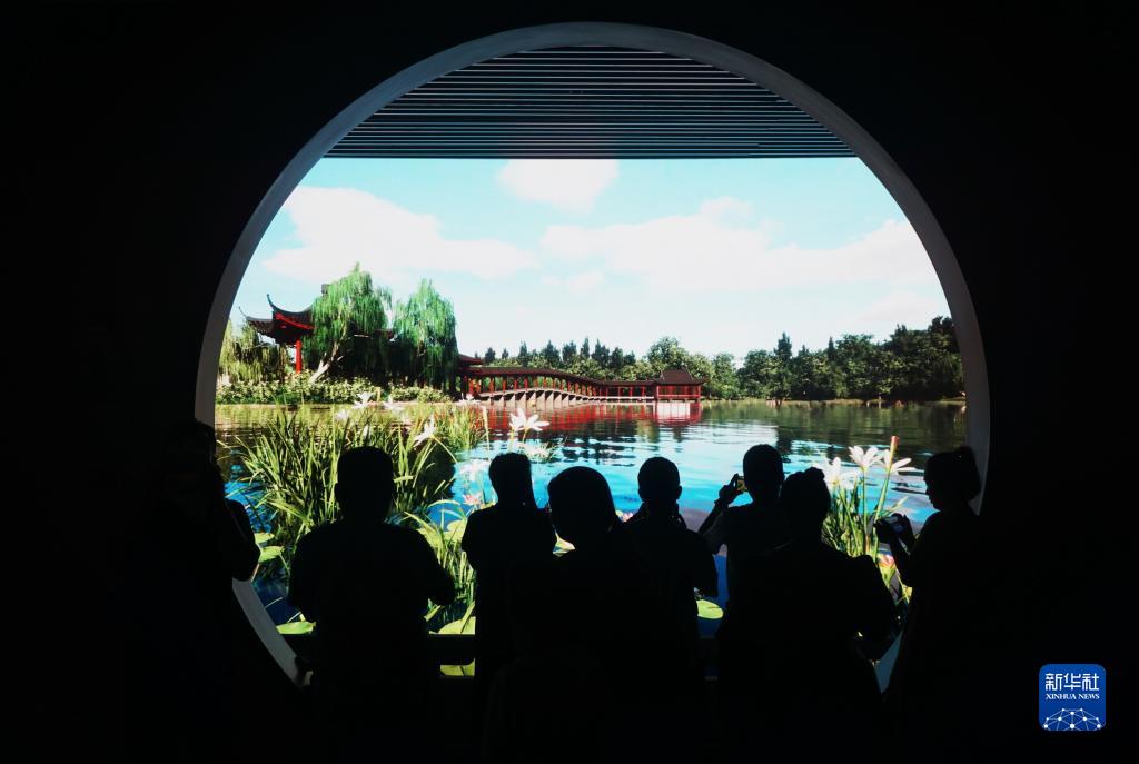 10月2日,參觀(guān)者在杭州西湖博物館觀(guān)看通過(guò)數字技術(shù)展現的杭州西湖景觀(guān)。