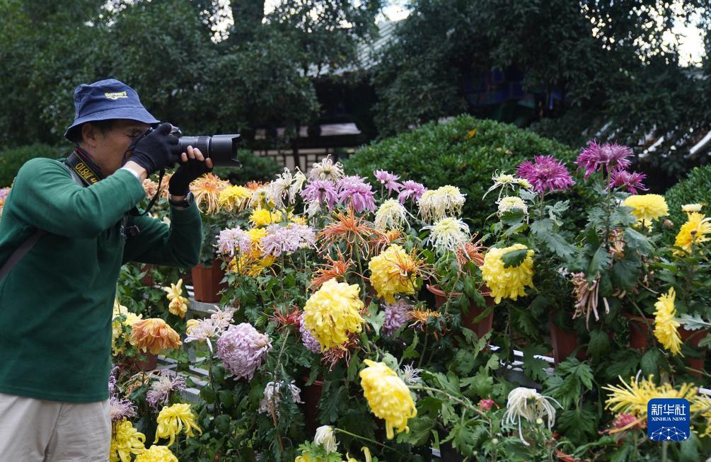 10月2日,游客在昆明市大觀(guān)公園菊展上賞菊、拍照。