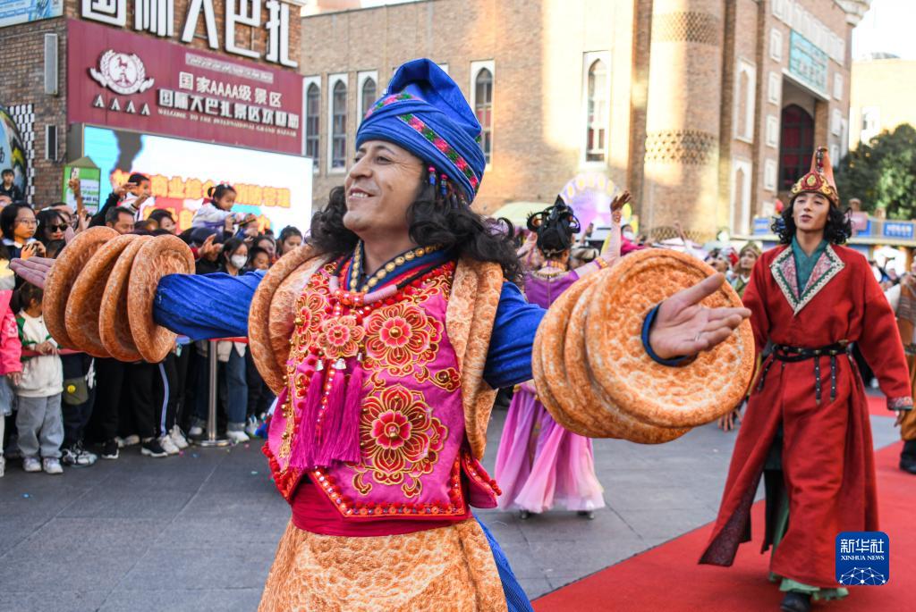 國慶假日期間,新疆烏魯木齊大巴扎步行街舉行的開(kāi)街儀式吸引了不少游客,別具一格的民族音樂(lè )、舞蹈、雜技等,讓游客近距離感受絲路文化。