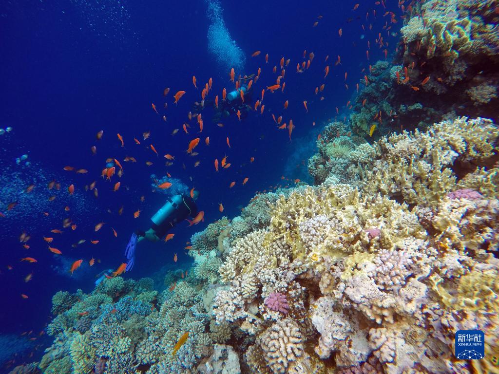 10月2日,人們在埃及西奈半島達哈布藍洞內的珊瑚旁深潛。
