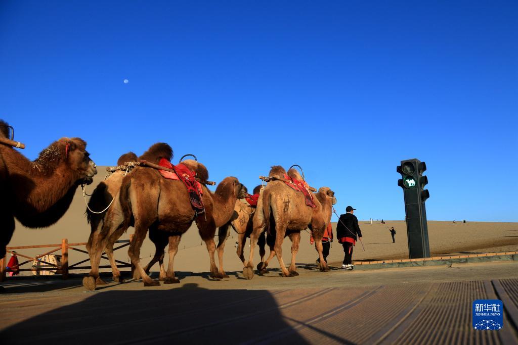 10月2日,甘肅省敦煌市鳴沙山月牙泉景區的交通信號燈“駱駝綠燈”亮時(shí),農戶(hù)牽著(zhù)駱駝?dòng)行蛲ㄟ^(guò)。