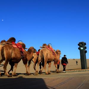 中秋、國慶假期期間,甘肅省敦煌市鳴沙山月牙泉景區迎來(lái)旅游高峰。設置在景區內行人步道和駱駝通道交叉點(diǎn)的交通信號燈“駱駝紅綠燈”引導人、車(chē)和駱駝?dòng)行蛲ㄐ?,確保了景區交通安全暢通。