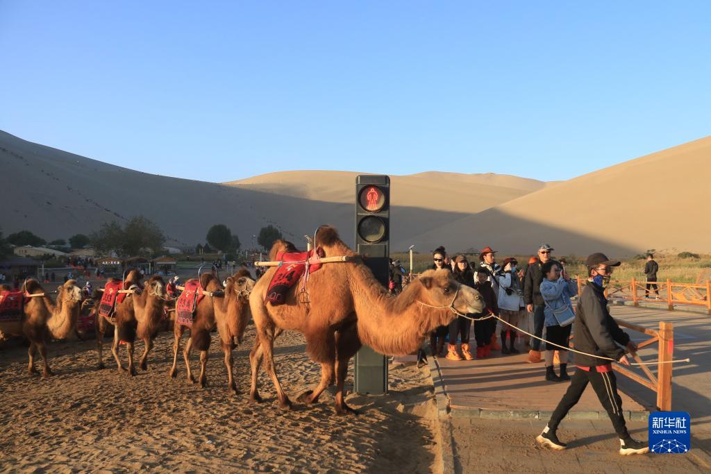10月2日,甘肅省敦煌市鳴沙山月牙泉景區的交通信號燈“行人紅燈”亮時(shí),游客在步道上停留等候,農戶(hù)牽著(zhù)駱駝?dòng)行蛲ㄟ^(guò)。