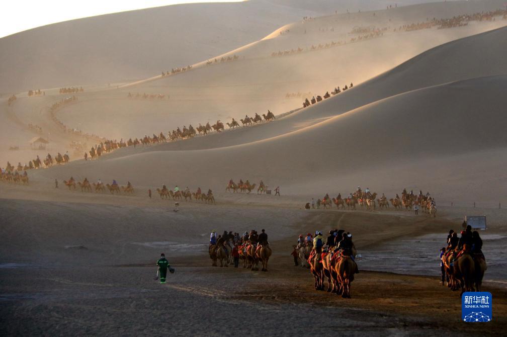 10月2日,游客在甘肅省敦煌市鳴沙山月牙泉景區體驗騎駱駝。