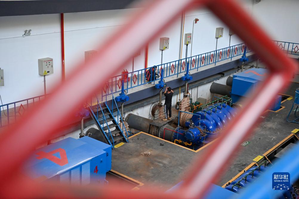 工作人員在大禹渡揚水工程內檢修養護泵站設備(9月21日攝)。