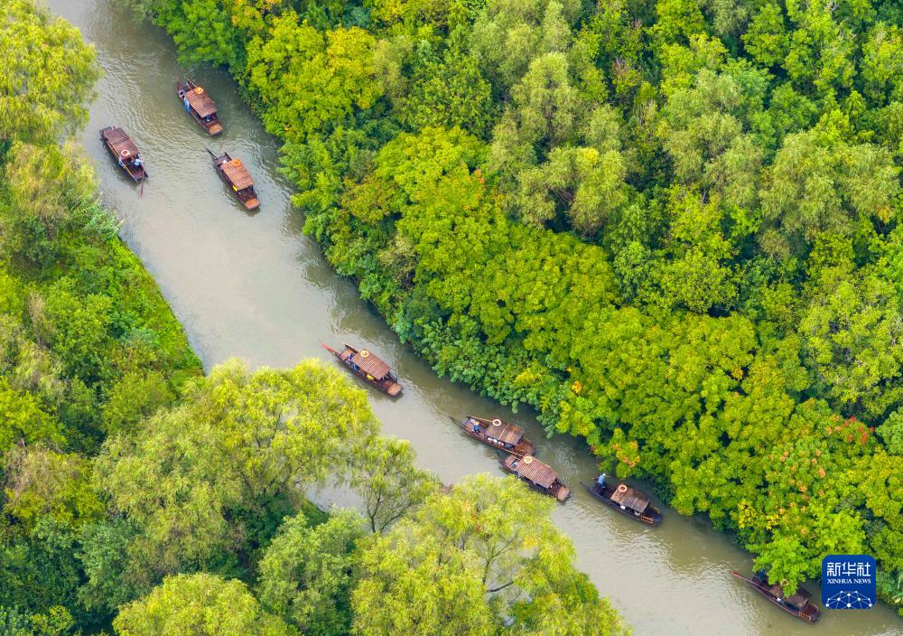 10月3日,游人在江蘇省泰州市姜堰區溱湖國家濕地公園乘搖櫓船游覽(無(wú)人機照片)。