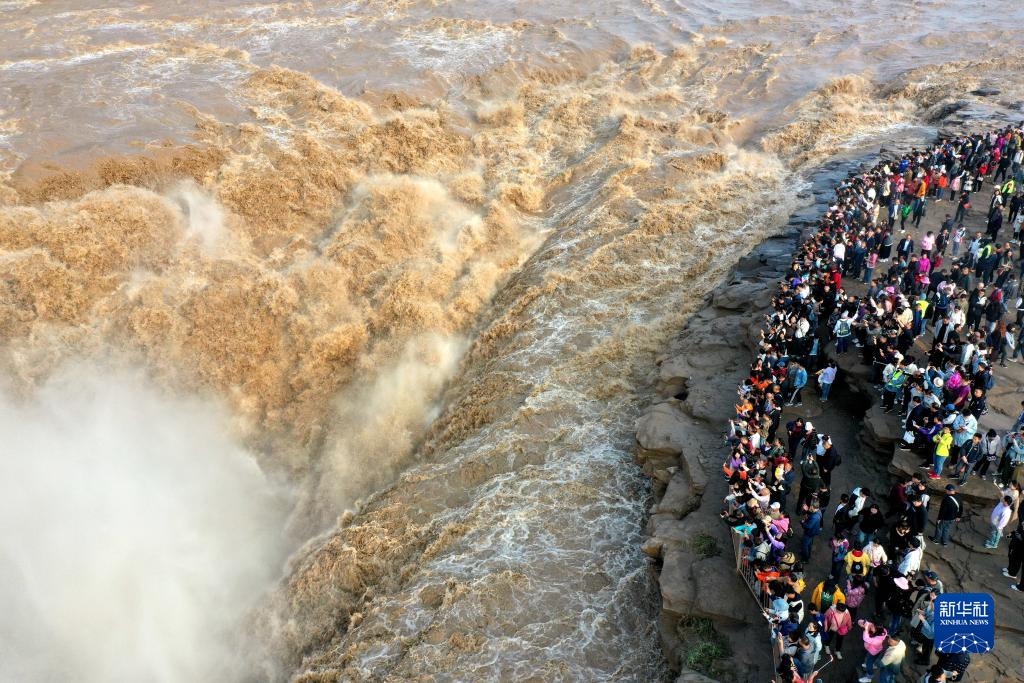 10月3日,游客在黃河壺口瀑布景區游覽(無(wú)人機照片)。