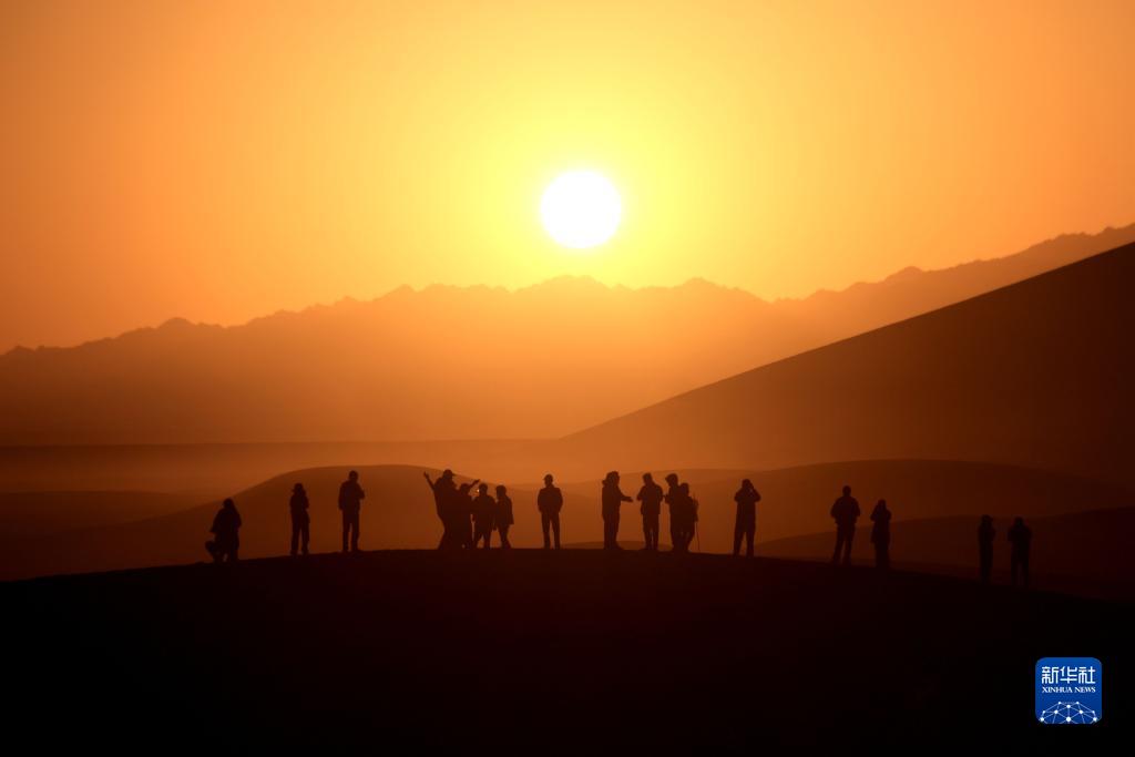 10月2日清晨,游客在甘肅省敦煌市鳴沙山月牙泉景區觀(guān)賞日出。
