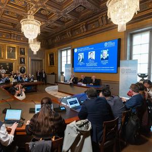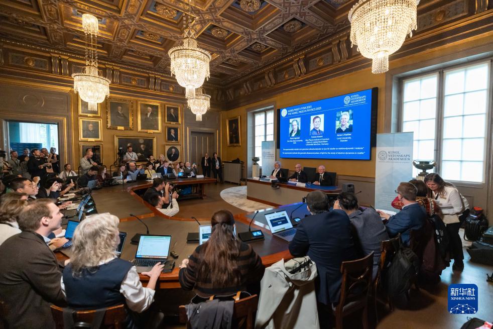 這是10月3日在瑞典斯德哥爾摩拍攝的2023年諾貝爾物理學(xué)獎公布現場(chǎng)。