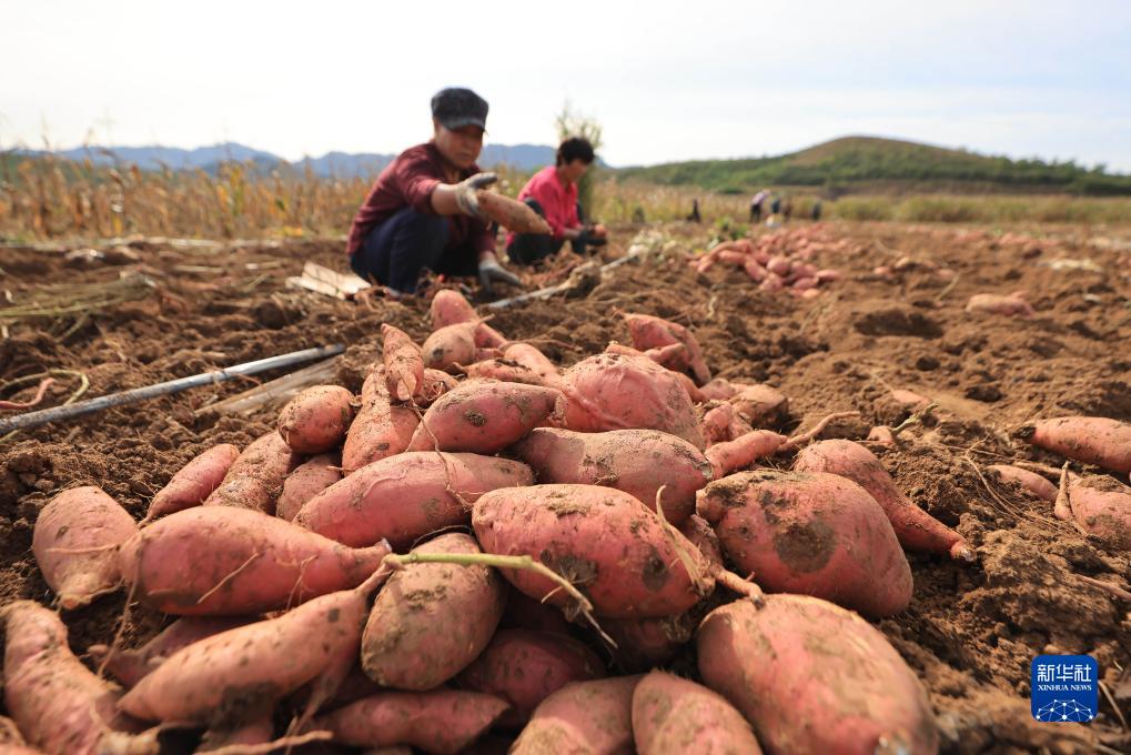 10月4日,河北省唐山市遷西縣新莊子鎮向陽(yáng)村農民在收獲山地紅薯。