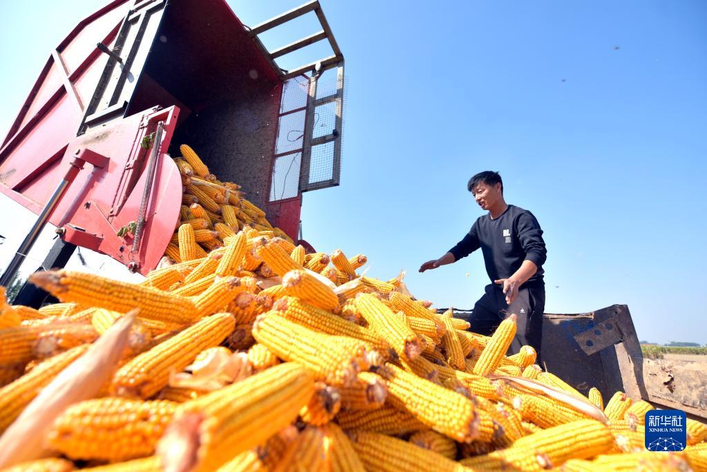 10月3日,在山東省聊城市茌平區賈寨鎮侯樓村,村民在田間收獲玉米。