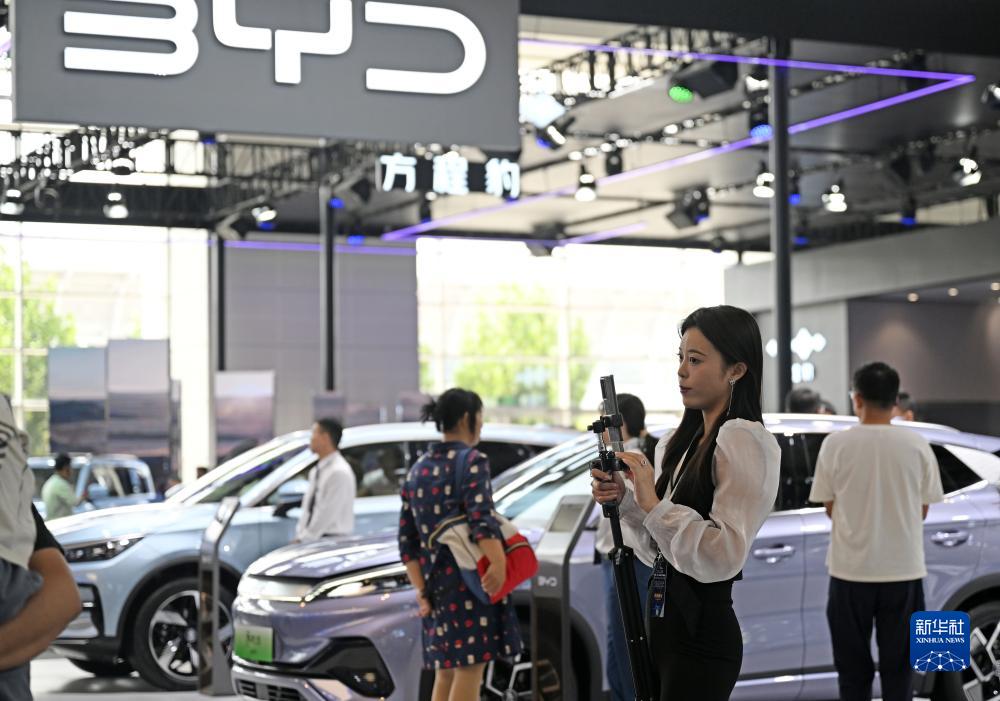 10月4日,一名主播在比亞迪汽車(chē)展臺進(jìn)行直播。