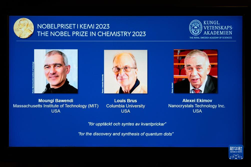 10月4日,在瑞典斯德哥爾摩的2023年諾貝爾化學(xué)獎公布現場(chǎng),屏幕上顯示獎項得主蒙吉·巴文迪(左)、路易斯·布魯斯(中)和阿列克謝·葉基莫夫的照片。