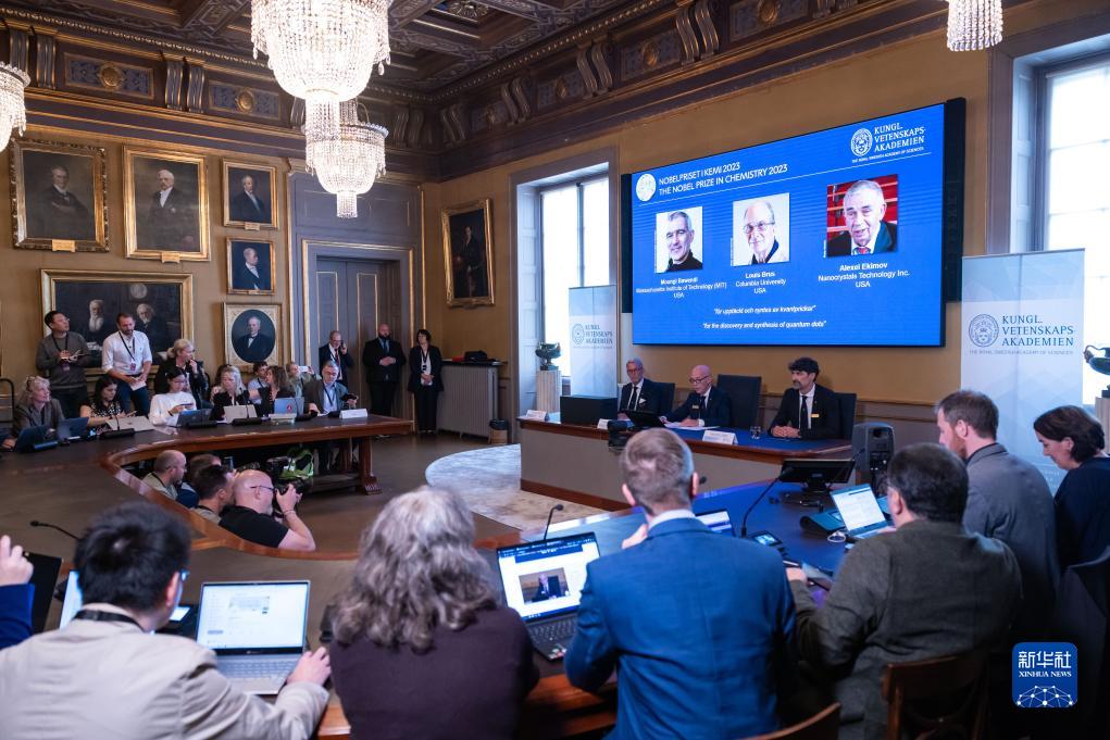 這是10月4日在瑞典斯德哥爾摩拍攝的2023年諾貝爾化學(xué)獎公布現場(chǎng)。