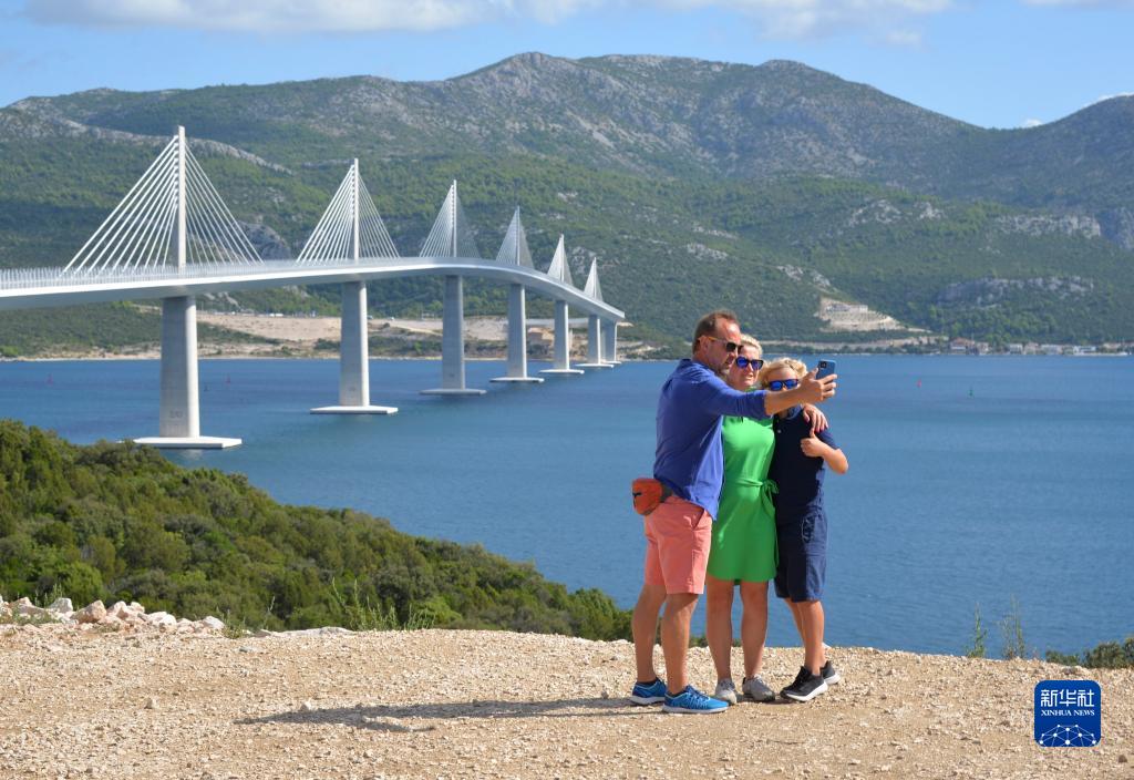 游客在克羅地亞佩列沙茨大橋前拍照留念(2023年8月29日攝)。佩列沙茨大橋橫跨克羅地亞南部亞得里亞海的小斯通灣,連接該國大陸與佩列沙茨半島,于2022年7月通車(chē)。