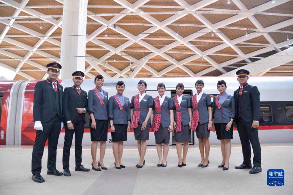 10月2日,乘務(wù)人員在印度尼西亞雅加達哈利姆高鐵站站臺和雅萬(wàn)高鐵動(dòng)車(chē)組合影。