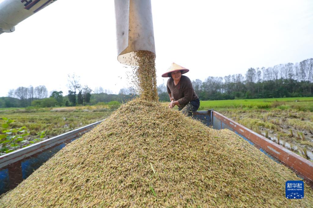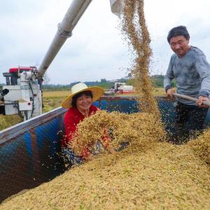 10月5日,在河南省信陽(yáng)市光山縣羅陳鄉張樓村,一家合作社社員在搶收水稻。