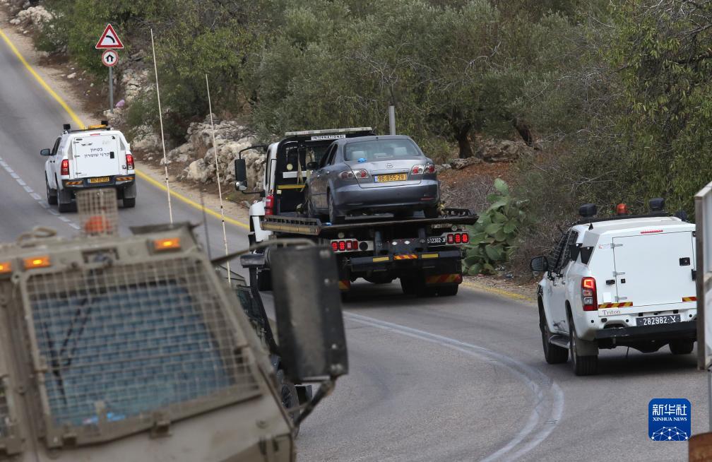 10月5日,以色列士兵在約旦河西岸城市圖勒凱爾姆附近轉移在沖突中受損的車(chē)輛。