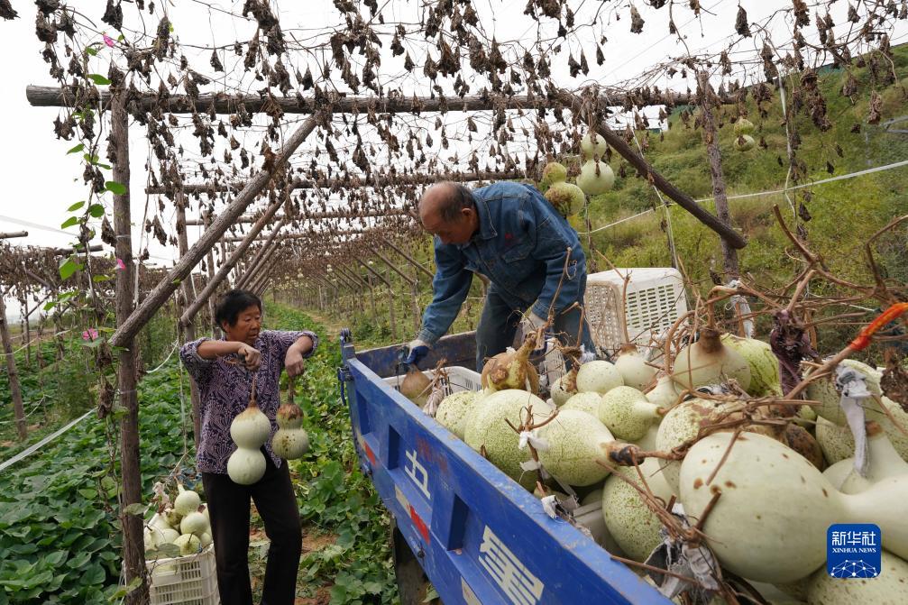 10月5日,河北省邢臺市信都區會(huì )寧鎮張爾莊村村民在將剛采收的葫蘆裝車(chē)。