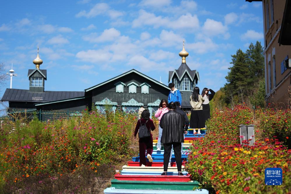 10月2日,游客在橫道河子鎮的文化藝術(shù)主題街區游覽拍照。
