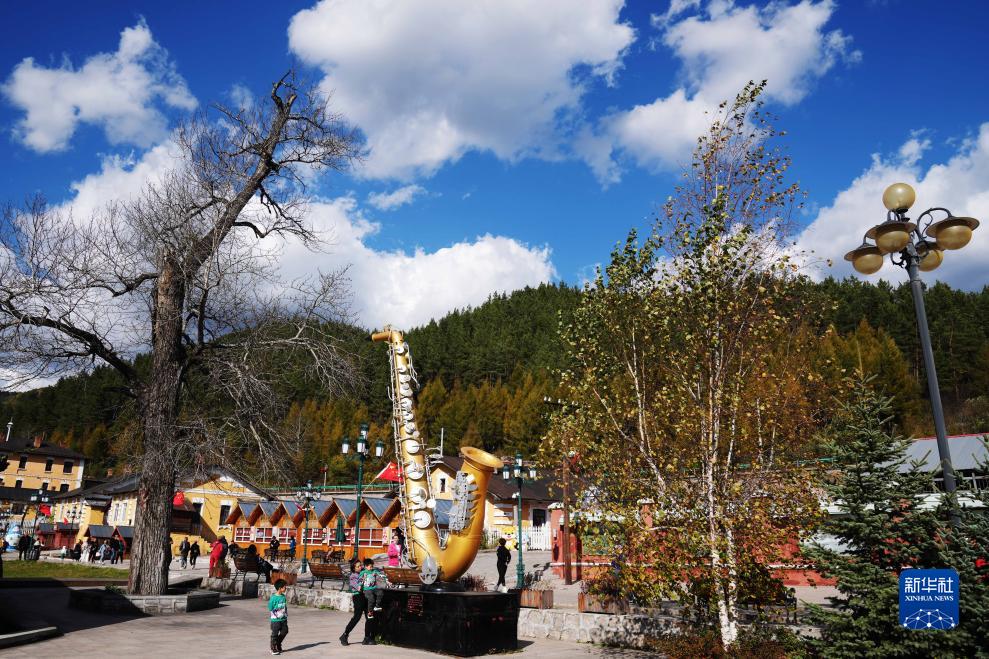 10月2日,游客在橫道河子鎮的文化藝術(shù)主題街區游覽拍照。