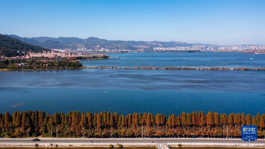 這是2023年1月12日拍攝的昆明滇池一景(無(wú)人機照片)。滇池自2018年上升為Ⅳ類(lèi)水質(zhì)后,連續5年保持全湖水質(zhì)Ⅳ類(lèi)。近年來(lái),昆明市通過(guò)開(kāi)展面山防洪滯蓄建設、實(shí)施雨污分流改造、建設湖濱生態(tài)帶、全面深化河長(cháng)制等措施,滇池生態(tài)狀況得到持續改善,滇池湖濱已形成平均寬度約200米、植被蓋度80%以上的閉合生態(tài)帶。
