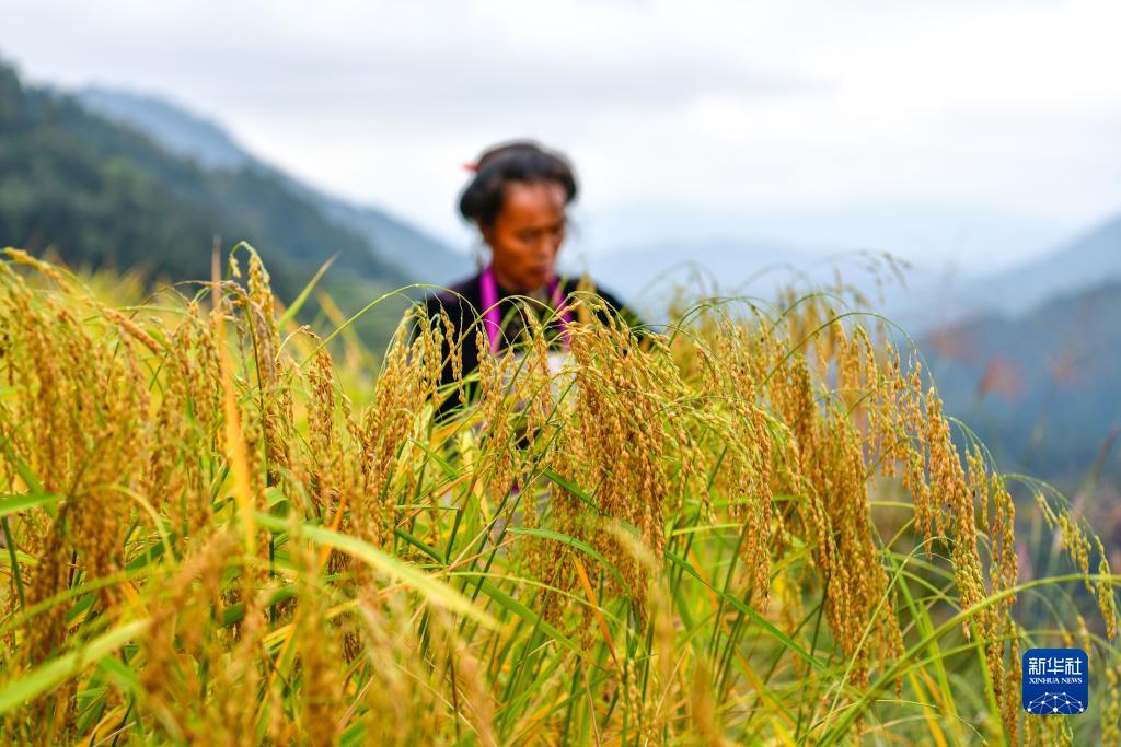 10月6日,農民在貴州省黎平縣雙江鎮黃崗村收割稻谷。