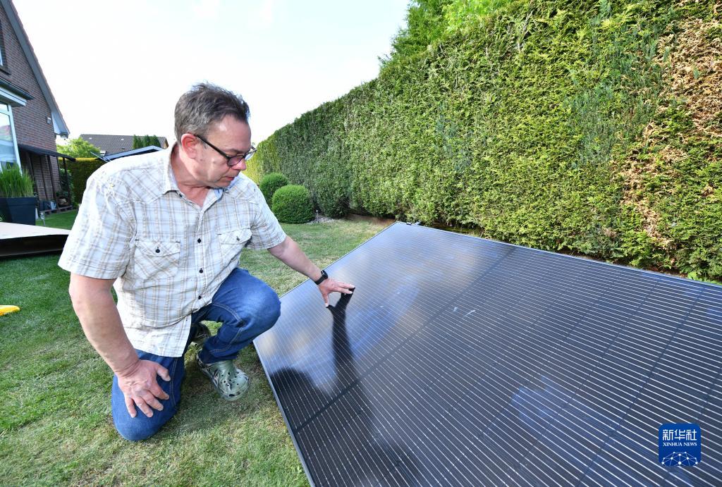 在德國施瓦岑貝克小鎮,當地居民迪爾克查看家中安裝好的中國產(chǎn)太陽(yáng)能設備(5月30日攝)。
