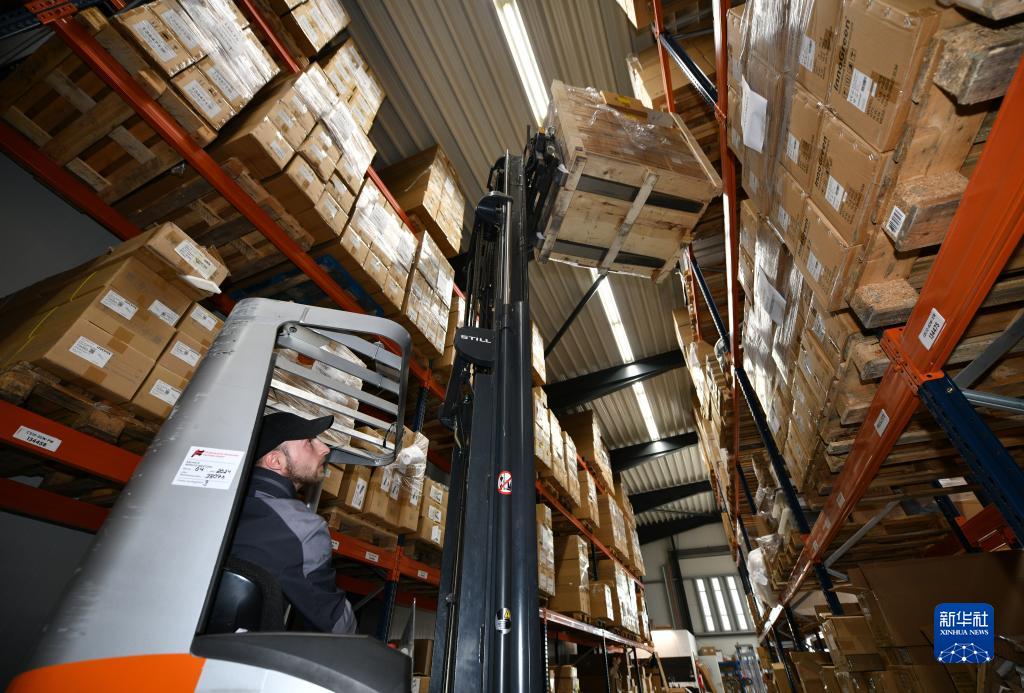 在位于德國阿倫斯堡的產(chǎn)品經(jīng)銷(xiāo)商勞克斯新能源有限公司,工作人員駕駛叉車(chē)搬運中國產(chǎn)微型逆變器產(chǎn)品(5月30日攝)。