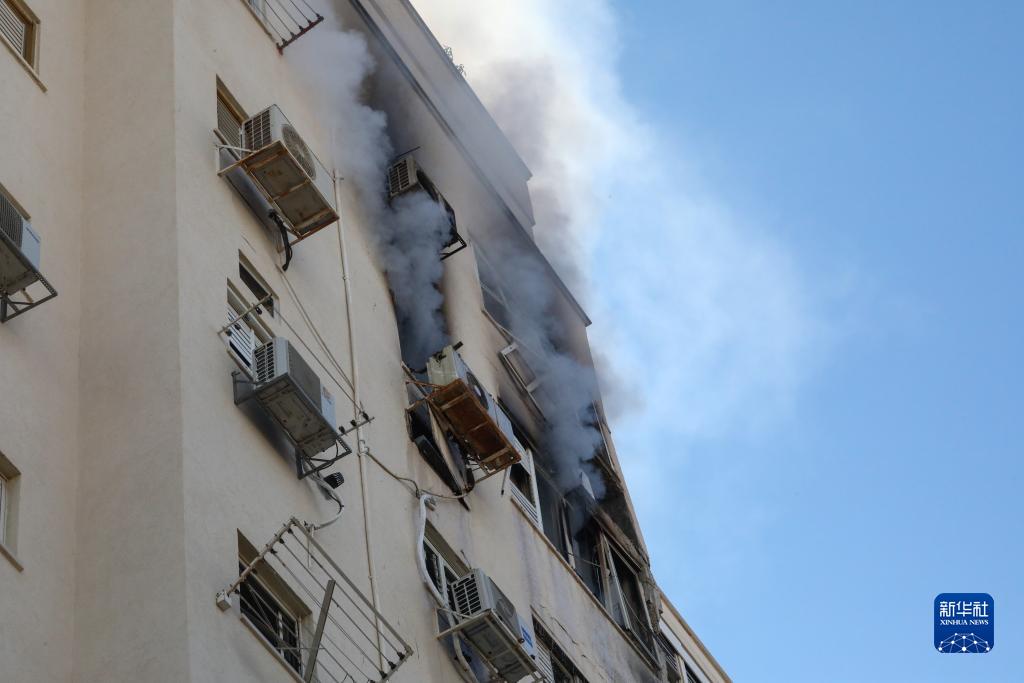 這是10月7日在以色列特拉維夫拍攝的一棟遭火箭彈襲擊的建筑。