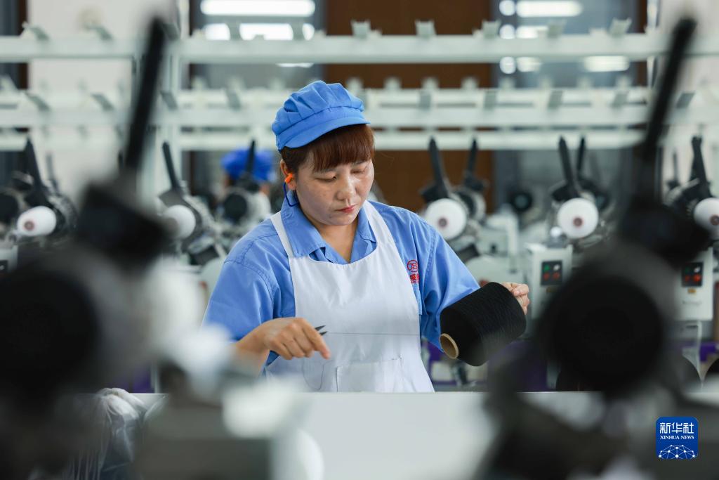 10月7日,工人在貴州省黔東南苗族侗族自治州三穗縣一家運動(dòng)服飾企業(yè)紡織車(chē)間工作。