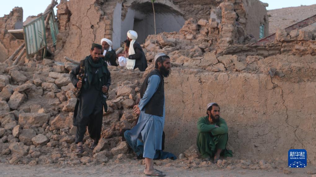 10月7日,人們在阿富汗赫拉特省坍塌的房屋旁等待。
