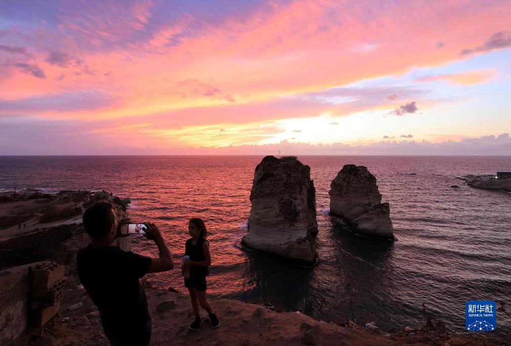 9月30日,人們在黎巴嫩貝魯特著(zhù)名景點(diǎn)鴿子巖觀(guān)賞日落并拍照。
