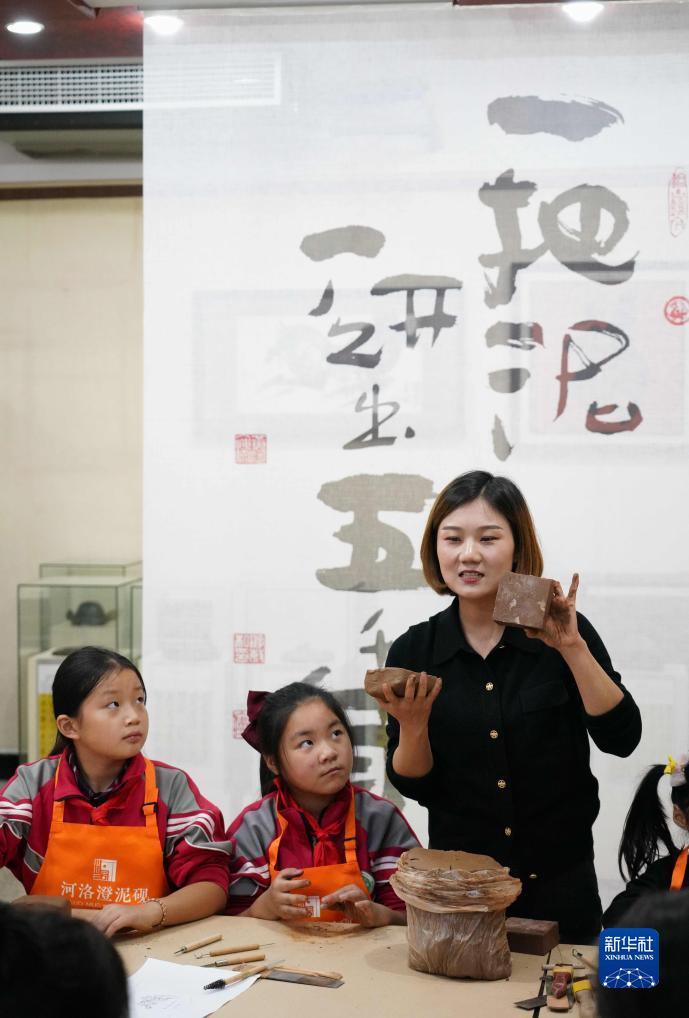 10月7日,在河南省洛陽(yáng)市新安縣河洛澄泥硯藝術(shù)館,游曉曉在教小學(xué)生制作澄泥硯。