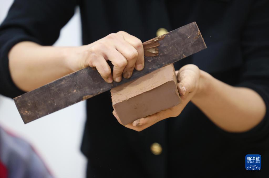 10月7日,在河南省洛陽(yáng)市新安縣河洛澄泥硯藝術(shù)館,游曉曉在教小學(xué)生刮平整形泥坯。
