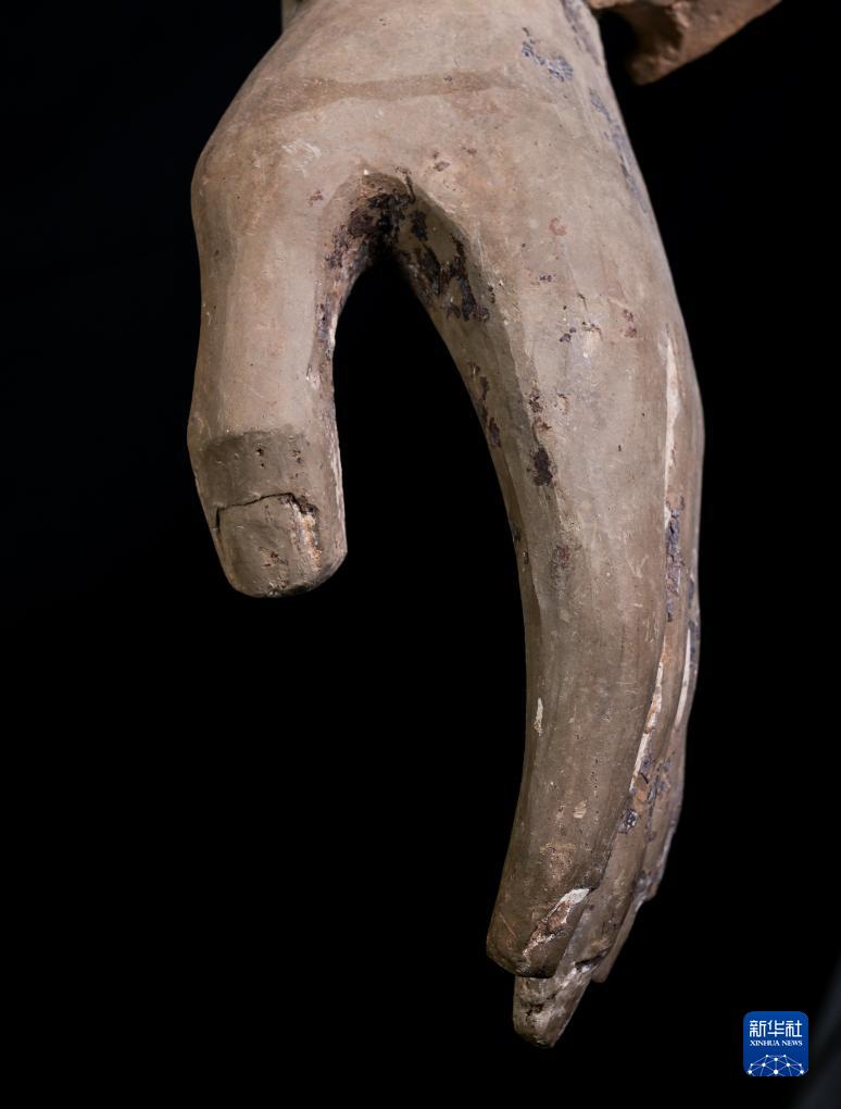 在秦始皇帝陵博物院文物保護部彩色陶俑修復室內,一尊秦俑的手部特寫(xiě)顯示出豐富的細節(8月23日攝)。