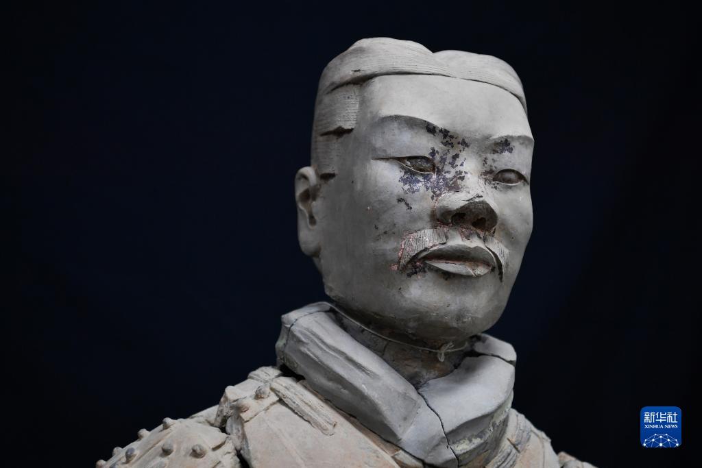 在秦始皇帝陵博物院文物保護部彩色陶俑修復室內,一尊秦俑臉部尚存部分彩繪層(8月23日攝)。