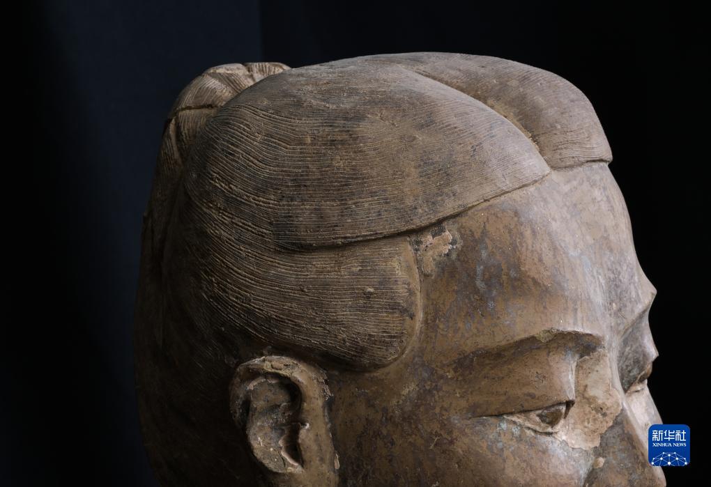 在秦始皇帝陵博物院文物保護部彩色陶俑修復室內,一尊秦俑的頭發(fā)分毫畢現( 8月23日攝)。
