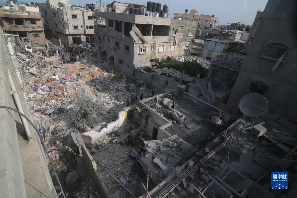 10月8日,在加沙地帶南部城市拉法,人們查看被以色列空襲炸毀的建筑。