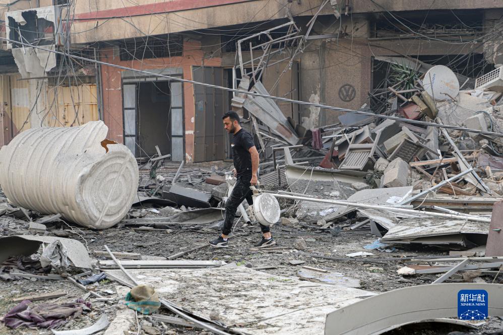 10月8日,在加沙城,一名巴勒斯坦人從以色列空襲后的建筑廢墟中尋找物品。