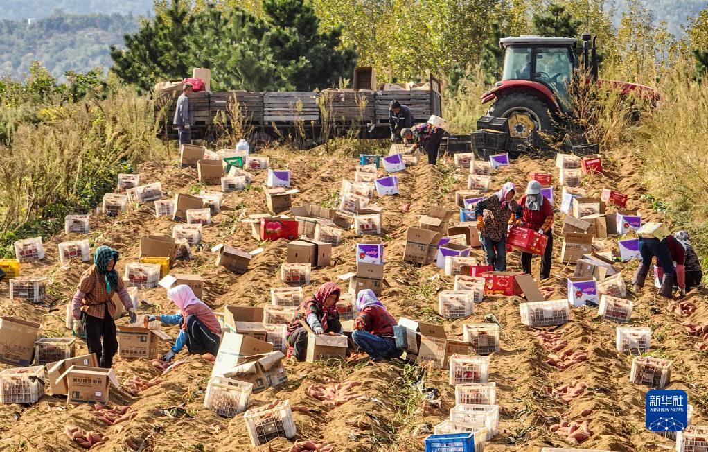 10月8日,在山東省榮成市埠柳鎮黃溝村,村民在收獲甘薯(無(wú)人機照片)。