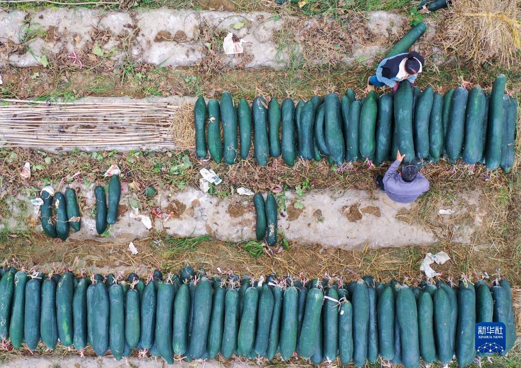 10月8日,農民在玉屏侗族自治縣田坪鎮長(cháng)嶺村采收冬瓜(無(wú)人機照片)。