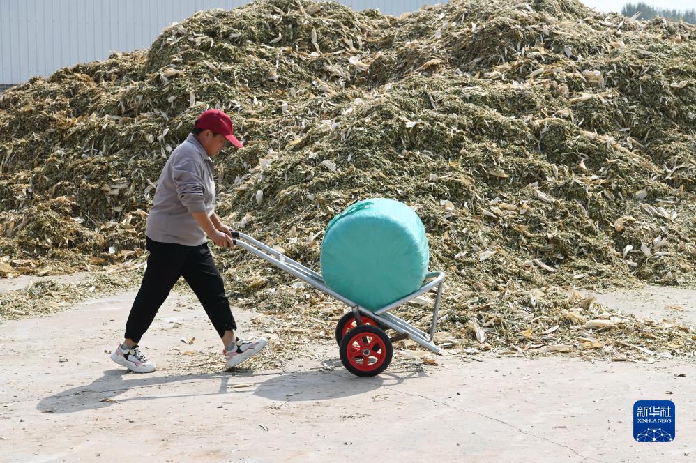 10月8日,在河南省沁陽(yáng)市柏香鎮南王村,一家種植專(zhuān)業(yè)合作社社員轉運加工好的青貯飼料包。