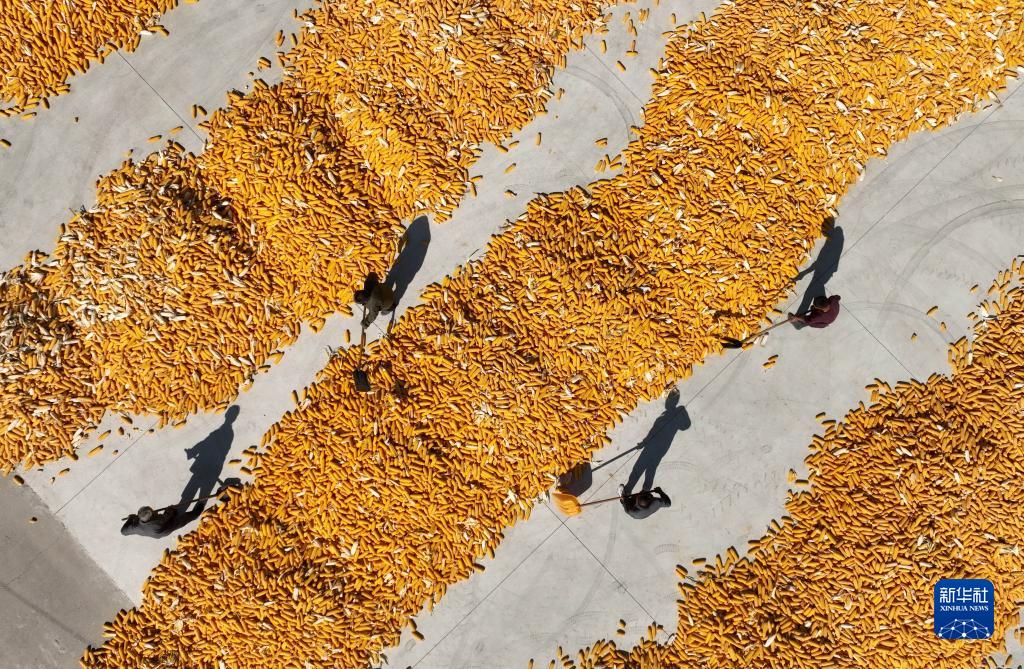 10月9日,河北省晉州市周家莊鄉的農民晾曬收獲的玉米(無(wú)人機照片)。